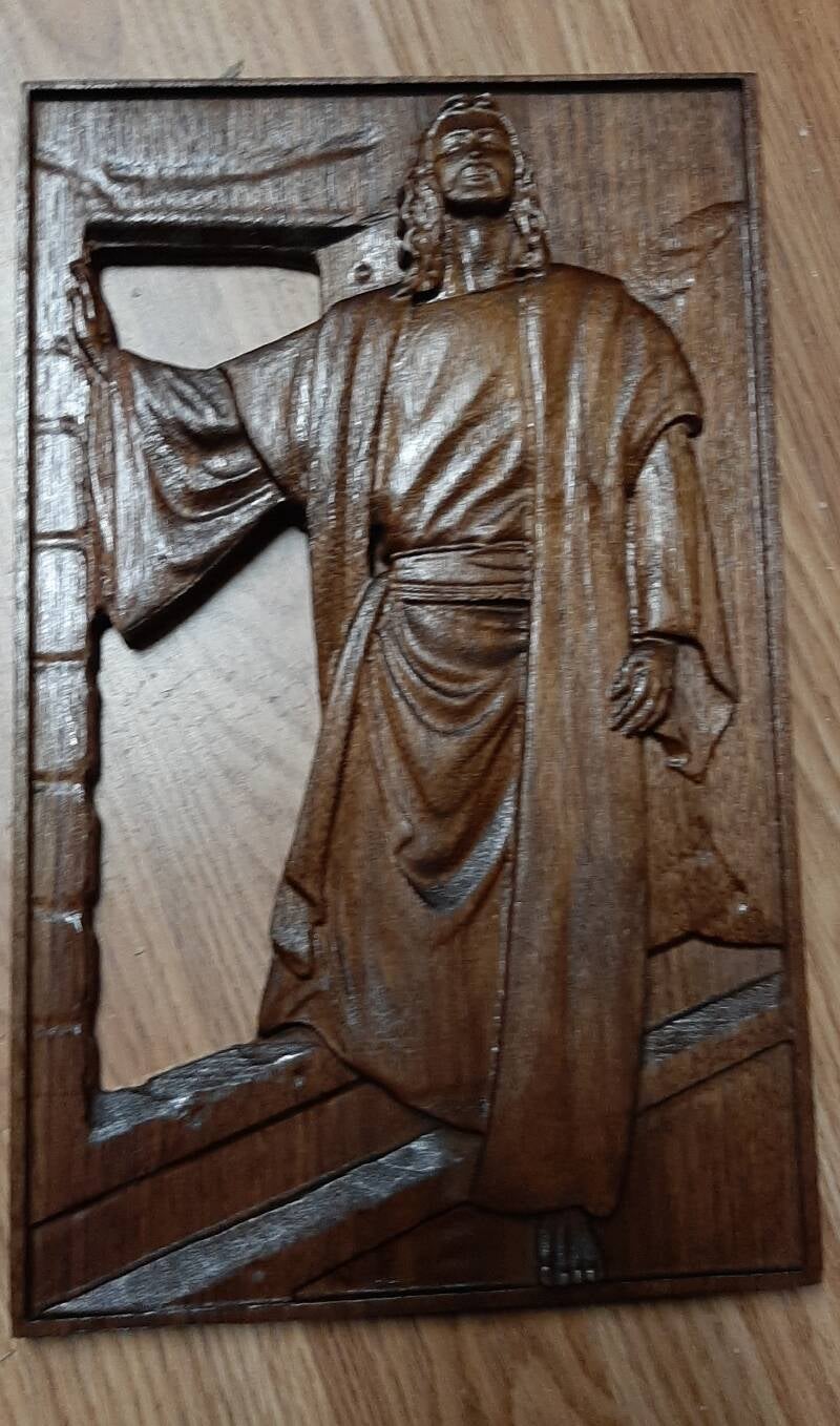 This rendering is of Jesus leaving the tomb. Made from walnut and 12x18" in size.